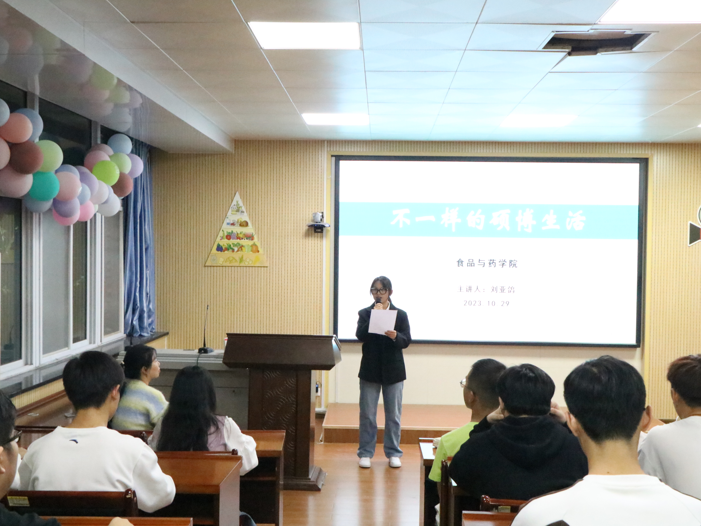 为促进师生交流,激发同学们的求学热情。我院于10月29日晚上19:00在食药楼N204举办第八季第一讲素质拓展论坛——不一样的硕博生活,并成功邀请到刘亚鸽老师担任主讲人,各年级同学积极参与。